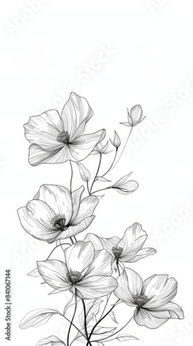 A simple, minimalist illustration of flowers in black and white against a white background, wallpaper, card