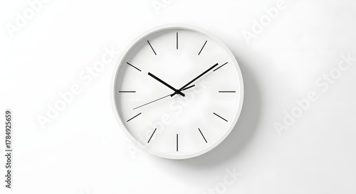 A simple white clock with black hands and markers on a white background in a minimalist style