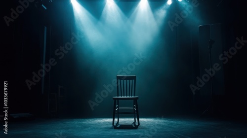 chair, stage, spotlight, performance, theatre, dramatic, empty, dark, blue, light, studio, wooden, single, seat, audience, back, waiting, lonely, beam, smoke, haze, artistic, mood, background, space, interior, photo, setting, lighting, shadow, photo