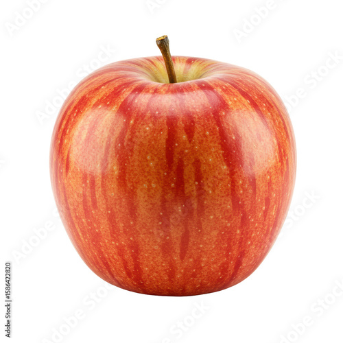 A single, perfectly fresh and ripe Gala or Honeycrisp apple with vibrant red and yellow stripes and a short brown stem, presented immaculately on a transparent plane with shadowless studio lighting,