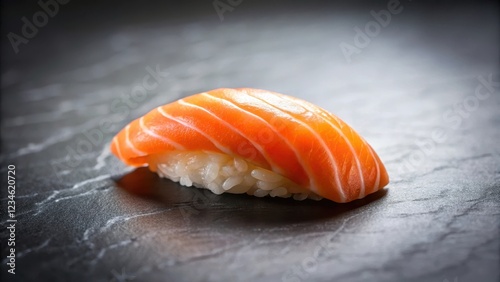 A single piece of salmon nigiri sushi placed on a dark grey background with subtle texture and soft focus effect , food