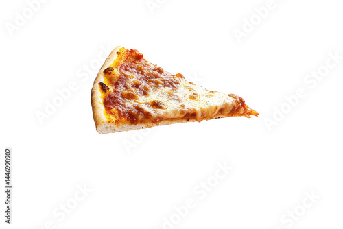 A single pizza slice with cheese and red sauce, crust exposed, sits isolated
