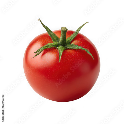 A single ripe red tomato with a green stem and leaves showcasing its fresh texture and vibrant color isolated on transparent background
