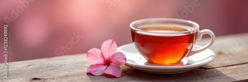 A single soft pink blossom rests beside a warm cup of tea, pink, calming