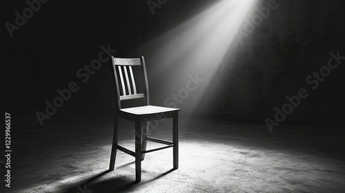 A single wooden chair illuminated by a dim spotlight in a dark, empty room, casting long shadows.