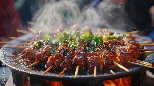 A sizzling plate of pork skewers freshly grilled to perfection and garnished with fragrant cilantro and toasted sesame seeds creating a mouthwatering Asian inspired savory delight