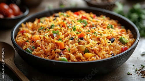 a skillet filled with freshly cooked rice, a wooden spoon resting beside it, showcasing the warmth of homemade meals and culinary creativity in a kitchen setting