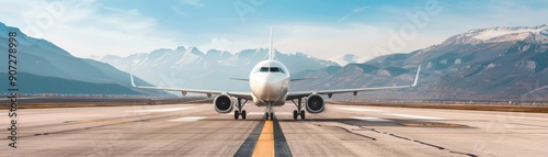 A sleek airplane on a runway with mountains in the background, showcasing aviation and travel in a stunning setting.