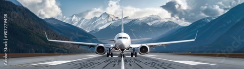 A sleek airplane preparing for takeoff on a runway surrounded by majestic mountains under a clear blue sky.