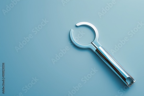 A sleek stainless steel tool resting on a soft blue surface, glinting in the light, showcasing modern design and functionality