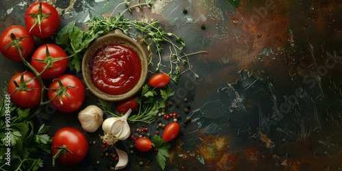 a small round saucer with ketchup sauce, cooking ingredients, ripe tomatoes, meat sauce, top view, dark background, copy space, free space for text