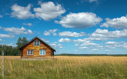 A small wooden house sits in a field of tall grass. The sky is clear and blue, with a few clouds scattered throughout. The scene is peaceful and serene