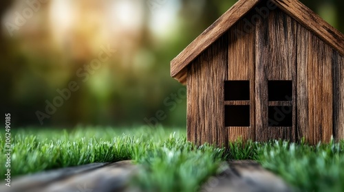 A small wooden model house sits gracefully amidst lush grass with a backdrop of blurred sunlight, encapsulating concepts of home, nature, and tranquility.