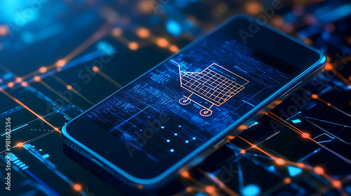 A smartphone with a shopping cart icon on the screen, resting on a futuristic digital background.
