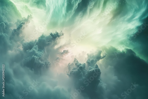 A soft, cloudy backdrop with subtle bursts of aurora-like colors and textures