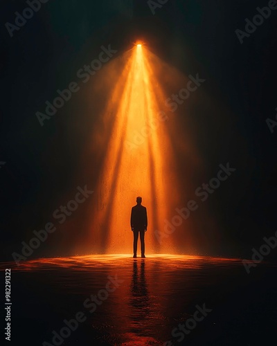 A solitary figure stands under a dramatic beam of light, creating an atmosphere of mystery and introspection.