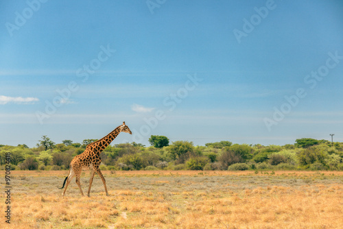 A solitary giraffe walking across the vast grasslands of a Botswana national park under a clear blue sky