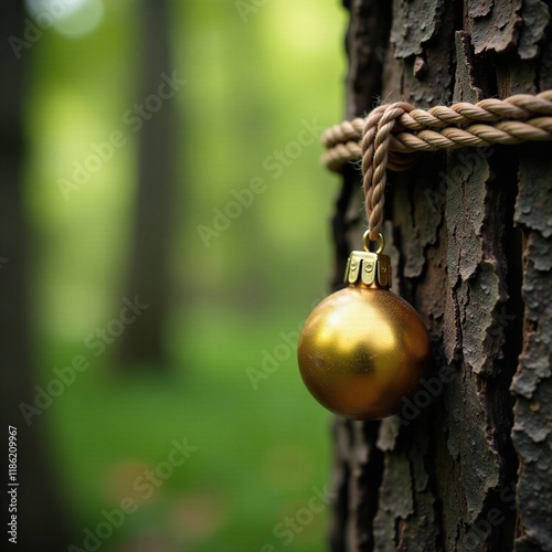 A solitary gold ornament suspended from a length of sturdy twine wrapped around a tree trunk, rugged, rough-hewn, tree trunk
