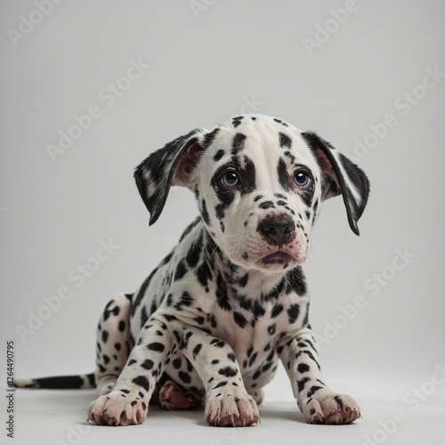A spotted Dalmatian puppy looking up curiously, sitting on a white backdrop.