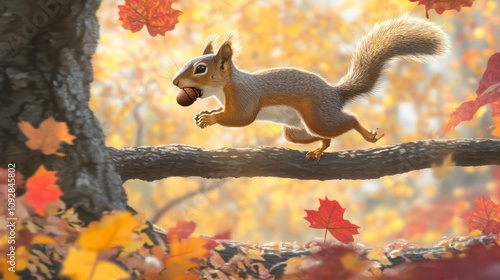 A squirrel energetically leaps across a branch in a vibrant autumn forest.