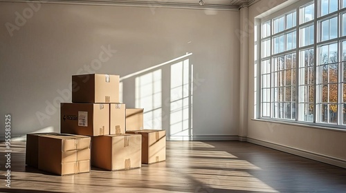 A stack of cardboard boxes in a bright, empty room with large windows casting soft shadows on the floor.
