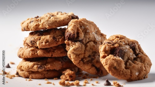cookie, chocolate, chips, sweet, baked, dessert, delicious, treat, snack, food, pastry, brown, gold, tasty, crumb, sea, salt, stack, pile, heap, group, photo, studio, still, life, closeup, macro, texture, background, white, epicure, homemade, bakery, fresh, crispy, buttery, chocolate, sweetness, indulgence