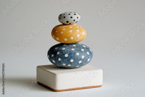 A stack of three decorative stones, each with a polka dot pattern in muted shades of gray, yellow, and blue, sits atop a simple, off-white rectangular base.