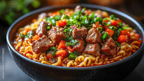 A steaming bowl of Asian-style noodles with tender beef chunks, fresh vegetables, and garnished with green onions and sesame seeds