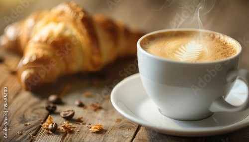 A steaming cup of coffee with a croissant and coffee beans in the background.
