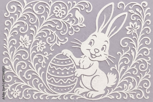 A stencil with a cartoon rabbit holding an Easter egg among floral decorations. A decorative element for cutting, printing, and decorating windows.