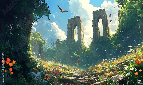 stone, path, garden, floral, ruin, ancient, overgrown, archway, tree, sky, cloud, sun, light, green, leaf, flower, orange, yellow, white, red, pink, blue, foliage, nature, beauty, landscape, scene, peaceful, calm, serene, dreamlike, whimsical, fantasy, magical, mystical