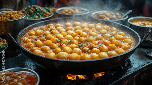A street vendor frying hot puris in a large wok, surrounded by bowls of chole, aloo curry, and pickles, ready for serving.