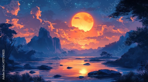 A striking evening landscape featuring a vibrant orange moon against a twilight sky illuminates the serene river flowing through the rugged mountain valley