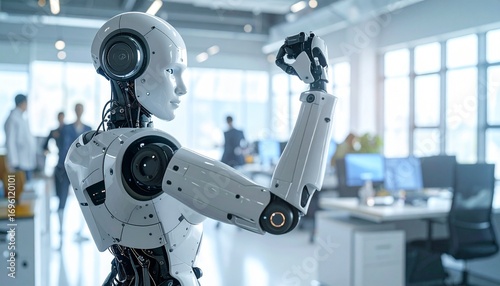 A strong AI robot in modern office. The advanced android shows off it's strength while flexing the arm. Many employee are in background