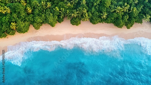 A stunning aerial view showcasing a beach featuring pristine white sand and vibrant blue water, capturing the essence of a tropical paradise.