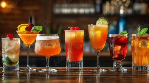 A stunning array of various cocktails sits on a polished bar counter, featuring colorful garnishes like fresh fruit and herbs. The atmosphere feels inviting and festive, perfect for socializing