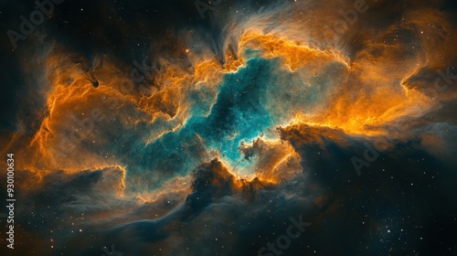 A stunning cosmic nebula with vibrant colors of orange, blue, and black, depicting space beauty.