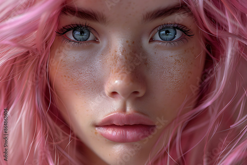 A stunning girl with expressive features, gazing ahead with beautiful pouty lips, detailed eyes, and lovely pink hair