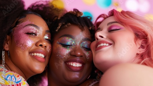 A stunning horizontal portrait highlights the beauty of multicultural plus-size women, adorned with glittery makeup against a pastel background.