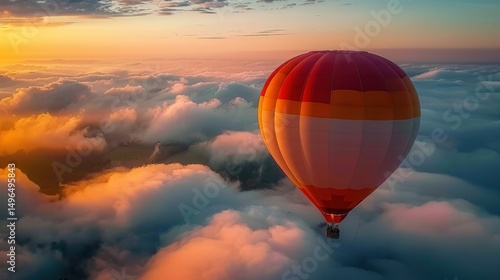 A stunning hot air balloon ascends above a vast, fluffy cloudscape during a vibrant sunrise.