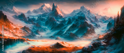 A stunning painting of a frozen waterfall in a snowy mountain range. The image captures the icy beauty of winter and conveys a sense of solitude. Generative AI