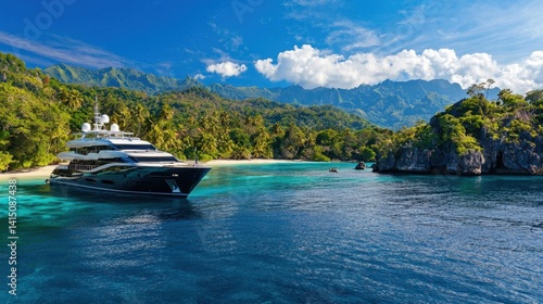 A stunning yacht rests in calm turquoise waters near a secluded beach, framed by towering green mountains and bright blue skies on a sunny day