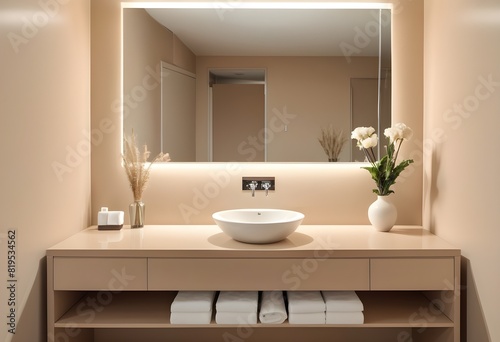 A stylish Beige hotel modern bathroom interior with sink and mirror, vase on countertop