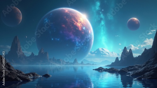 A surreal water planet where enormous floating orbs of liquid hover in midair, reflecting the iridescent glow of distant nebulae.
