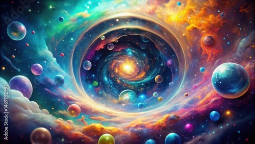 A swirling cosmic vortex reveals a vibrant galaxy filled with colorful planets and nebulae, a breathtaking celestial spectacle of infinite wonder and mystery