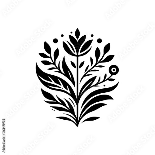 vector, floral, illustration, black, white, symmetric, stylised, bloom, leaf, branch, dot, oval, composition, graphic, design, minimalist, elegant, nature, botanical, decorative, plant, foliage, seed, flower petals, abstract, organic