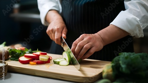 A talented chef in a professional kitchen, skillfully slicing a variety of colorful vegetables.