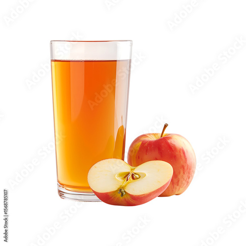 A tall glass of refreshing amber apple juice next to a whole red apple and a halved apple showing seeds and core isolated on transparent background
