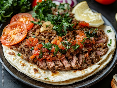 A Tantuni. The most popular Turkish dishes. A dish of thinly sliced beef or chicken, sautéed with tomatoes, onions, and spices, and served in a wrap or with flatbread.