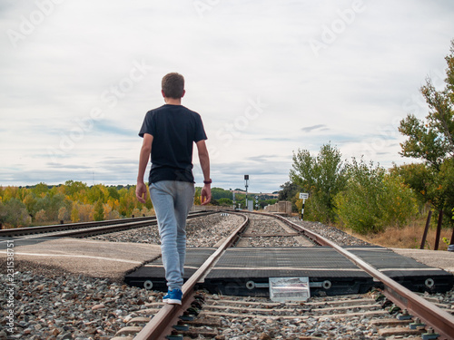 A teenage boy walking on the train tracks